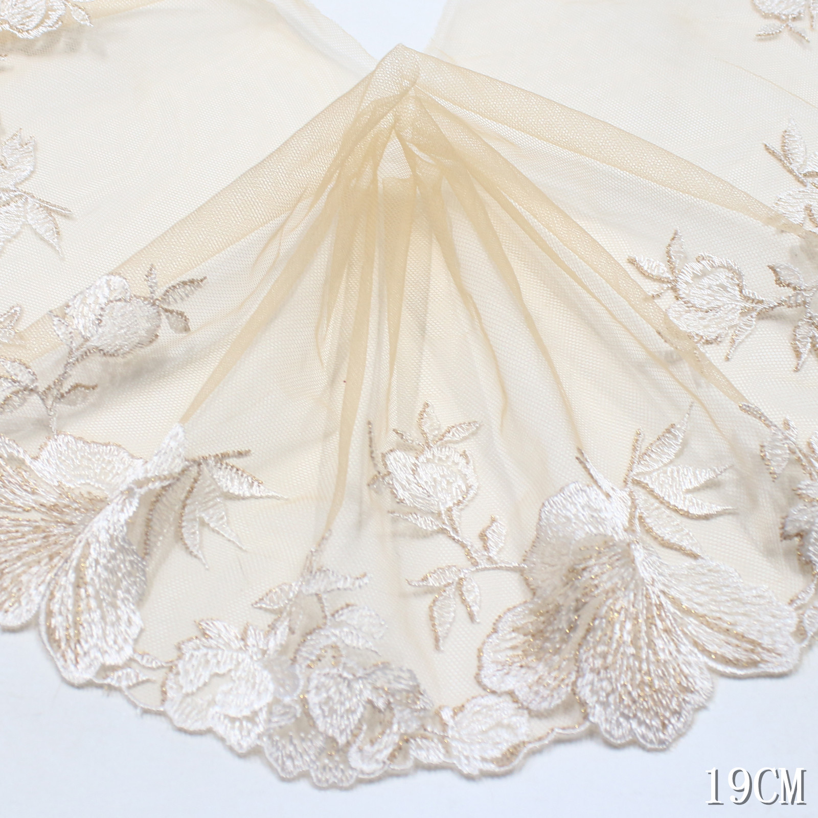 Set on a sheer nude (light apricot) tulle base, the lace appears light, airy, and naturally soft. The transparency enhances the floral pattern while maintaining a gentle and feminine tone.