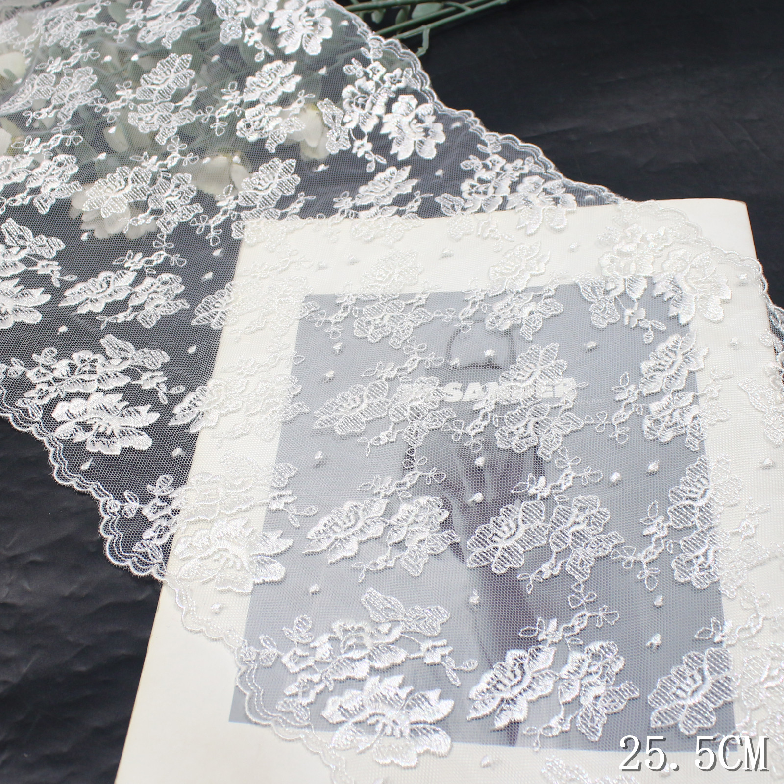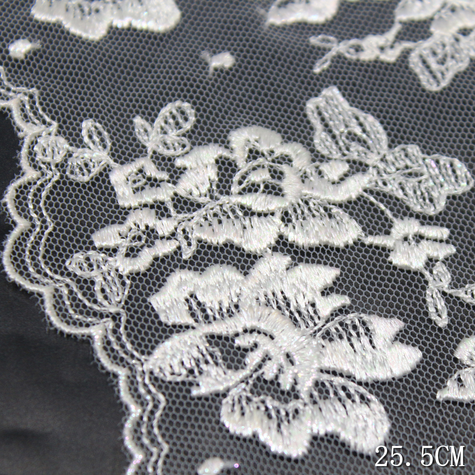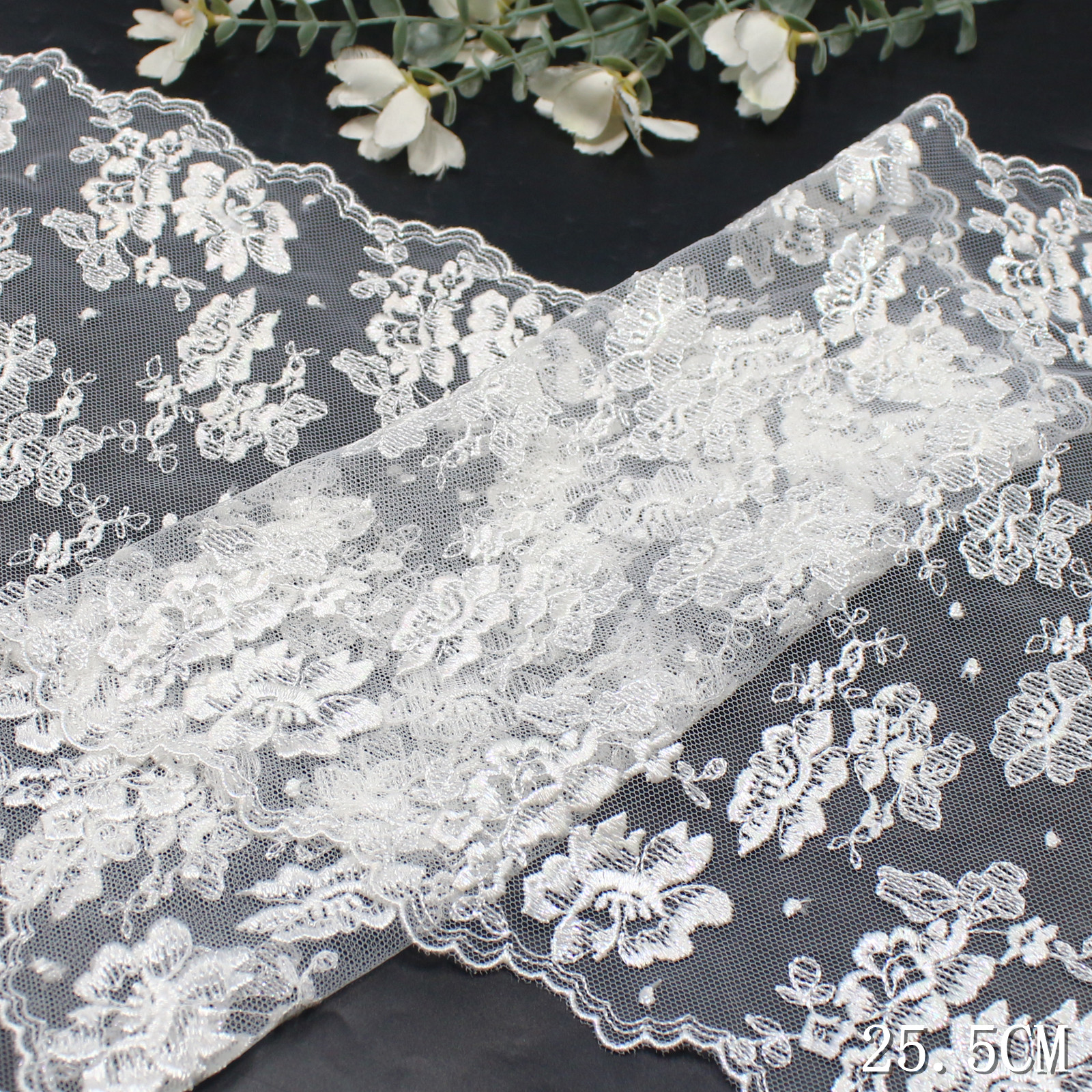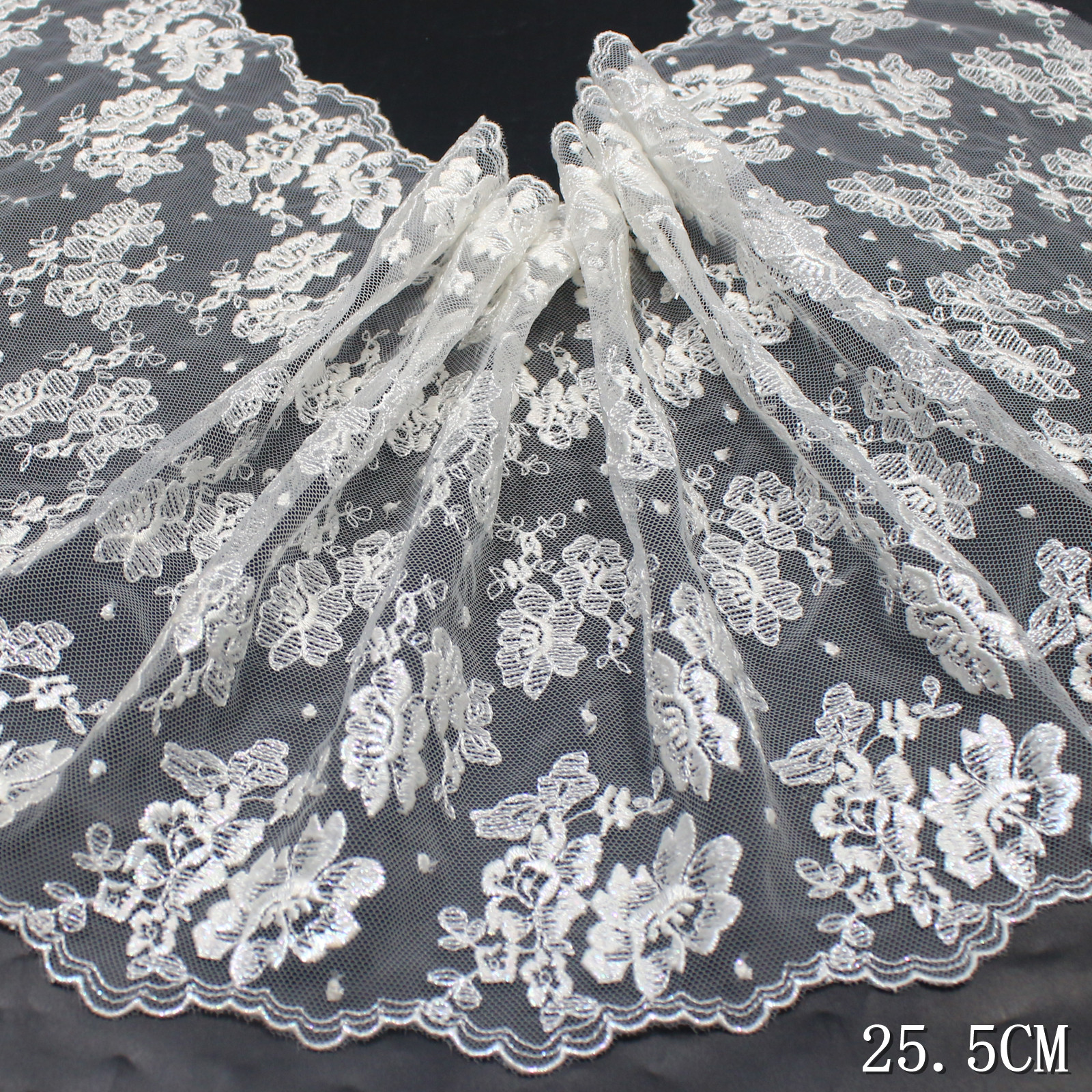 Set on a sheer white tulle base, the lace appears light, airy, and slightly translucent, allowing the floral pattern to float naturally. The 25.5 cm width gives the design a wide, open layout, ideal for statement applications.