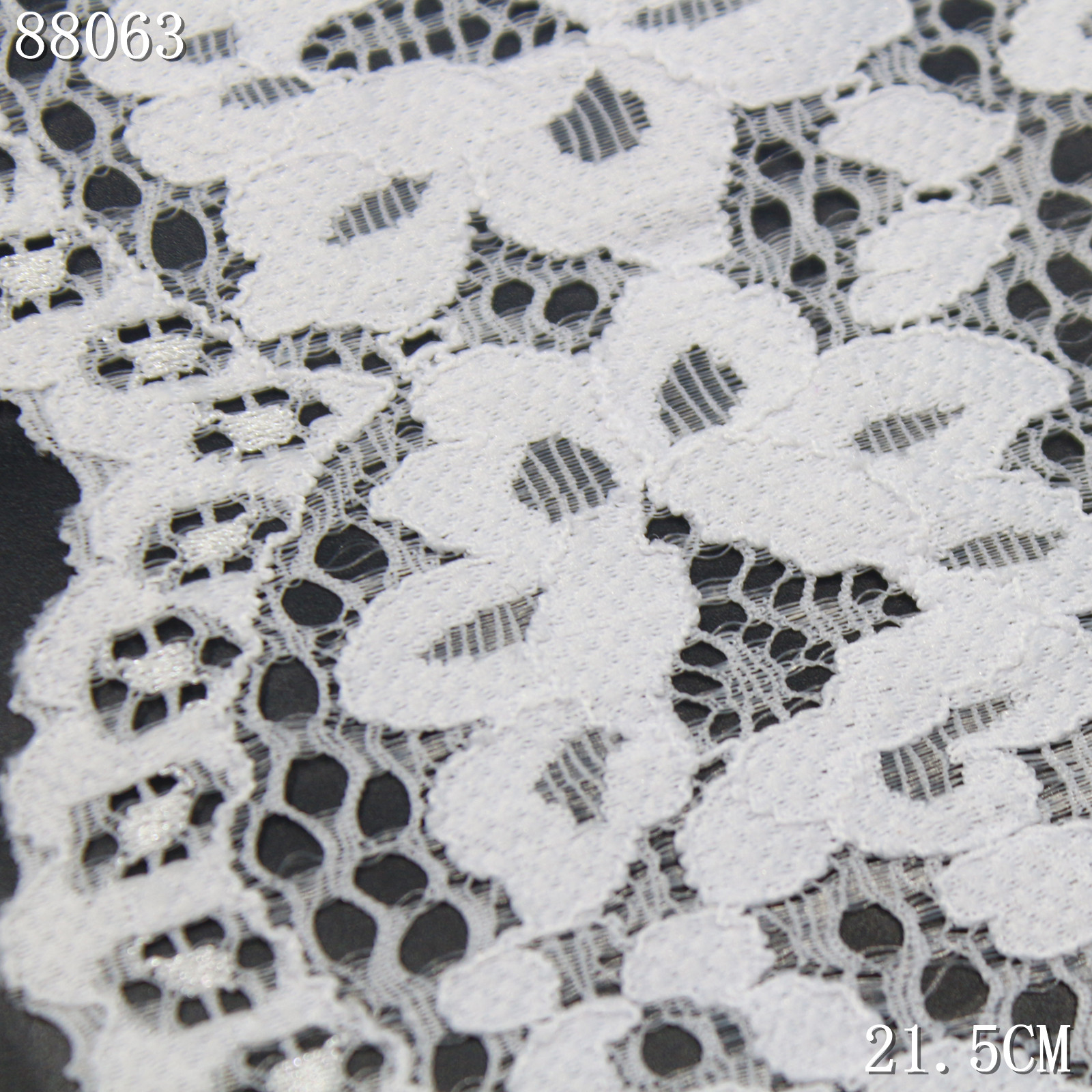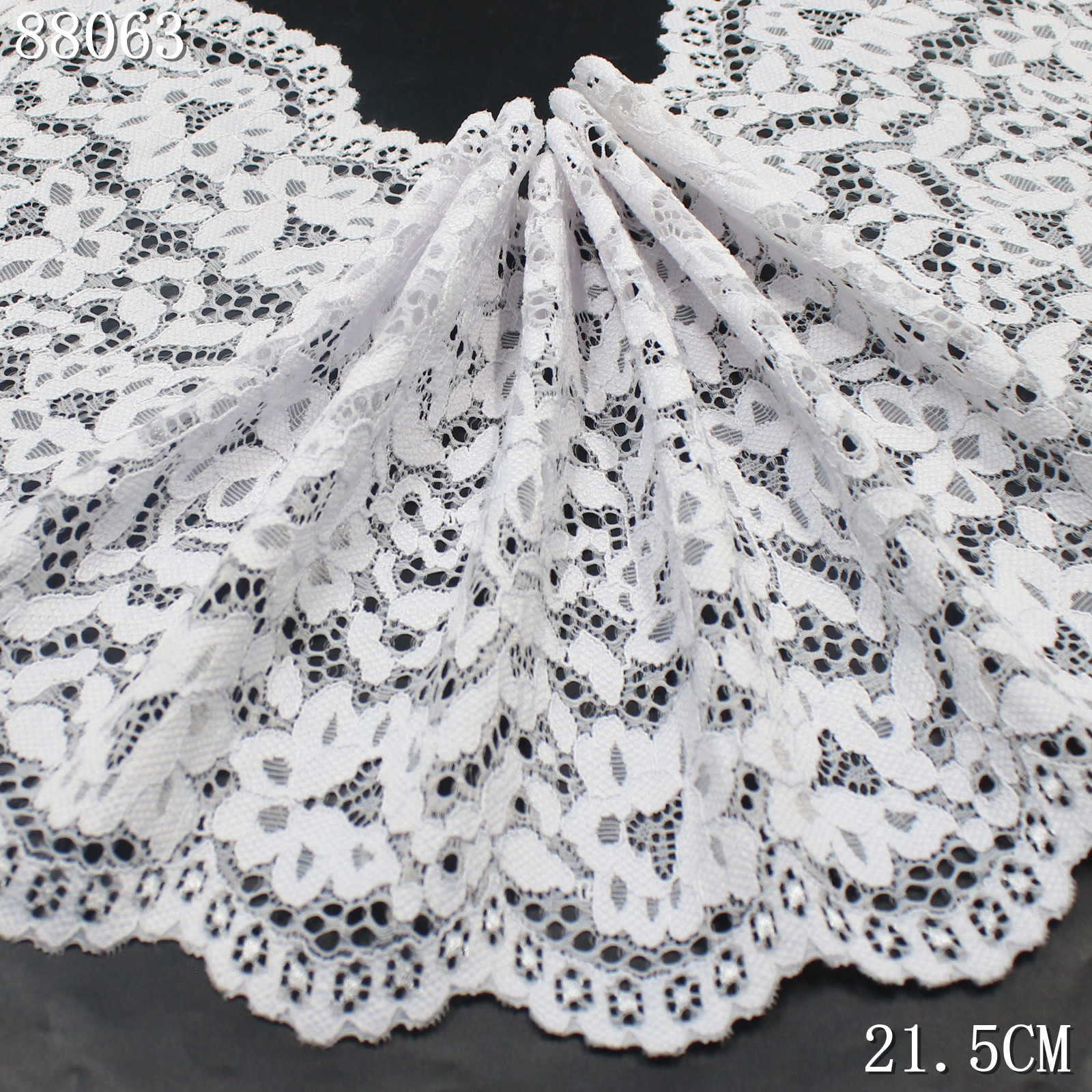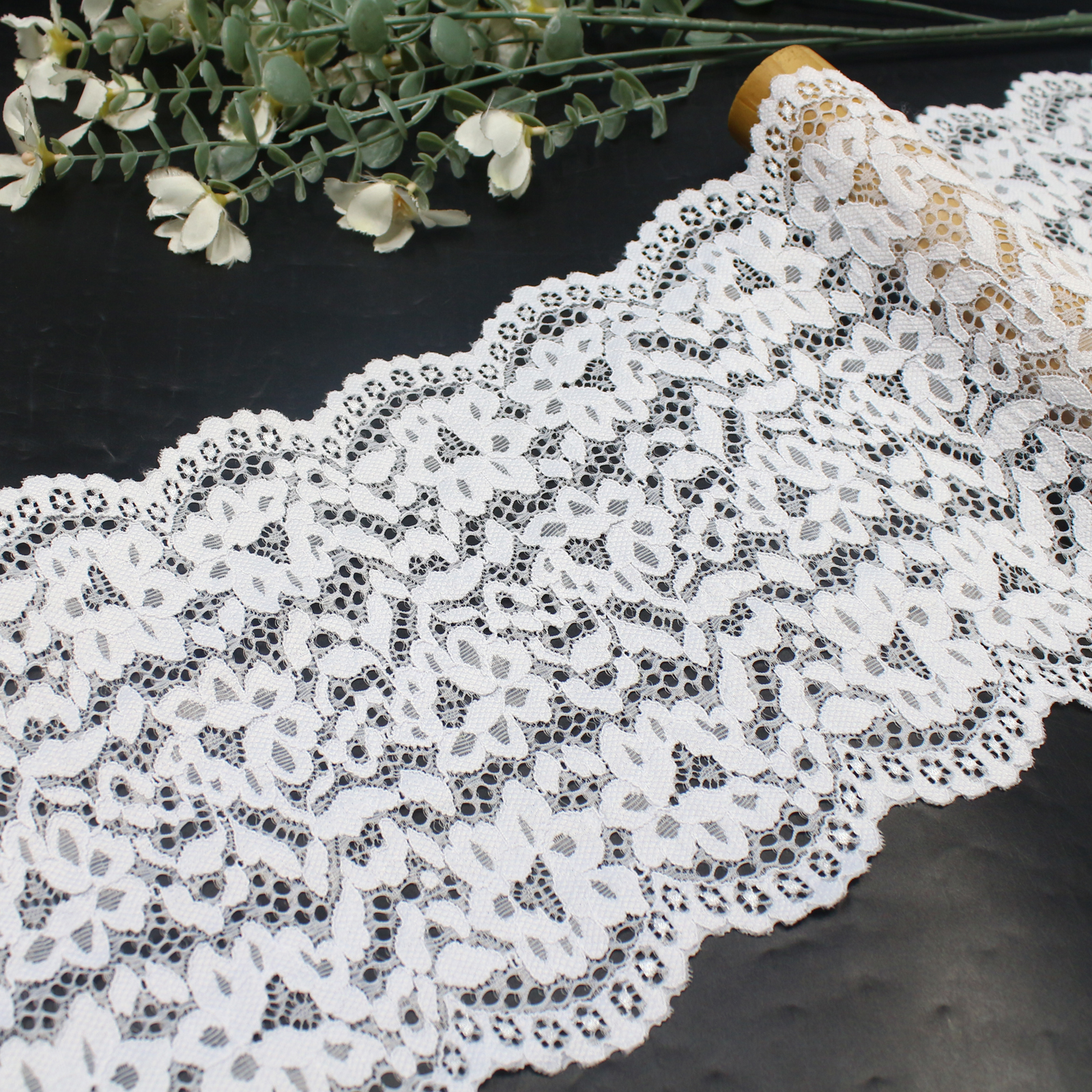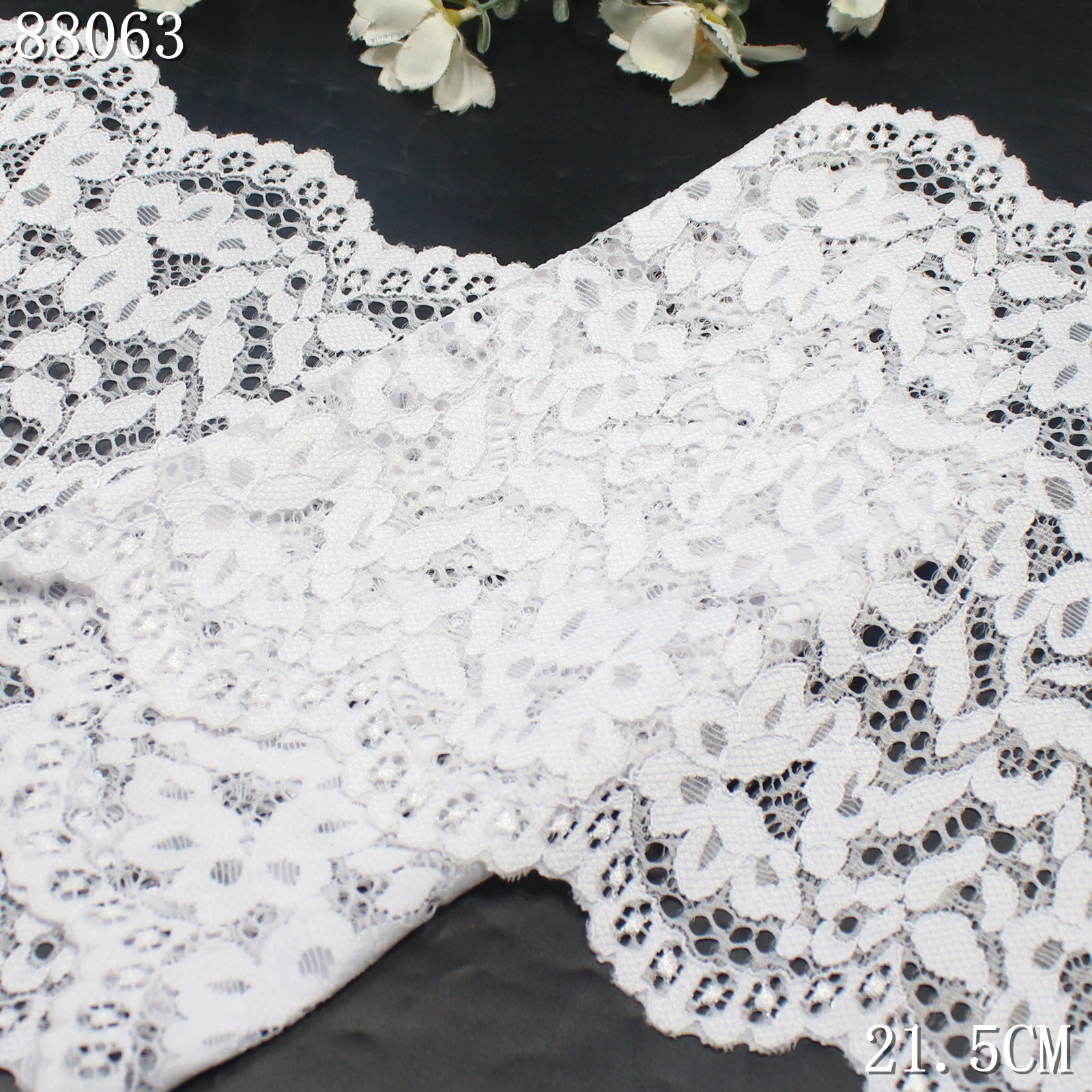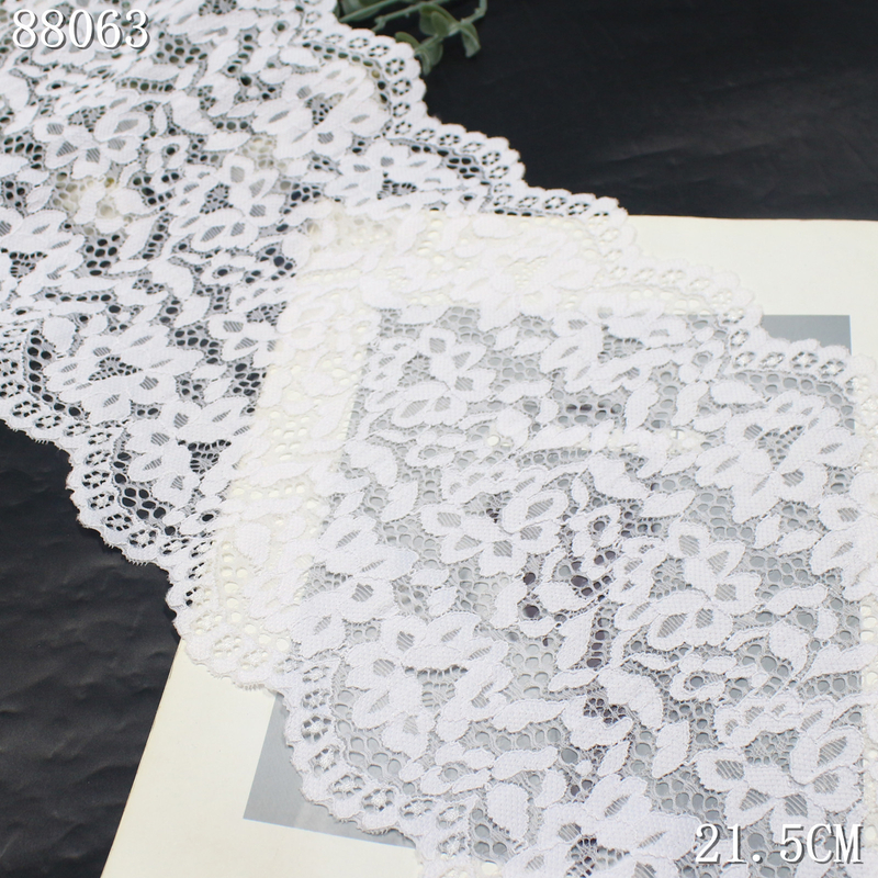 This white stretch lace trim is crafted on a high-elastic lace base with a width of 21.5 cm. The lace features evenly arranged small floral motifs that create a clean and delicate decorative appearance.