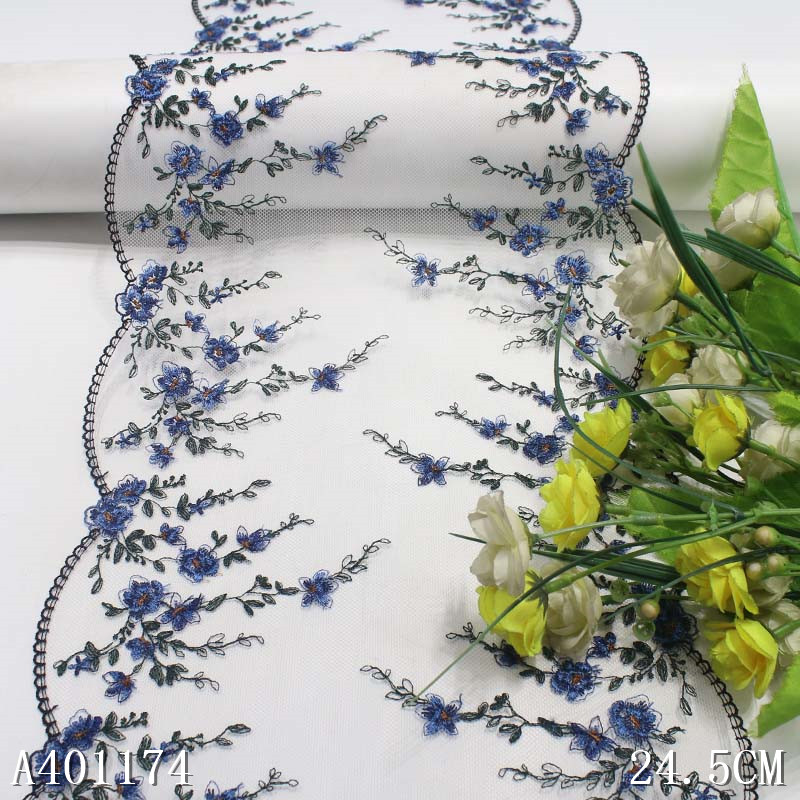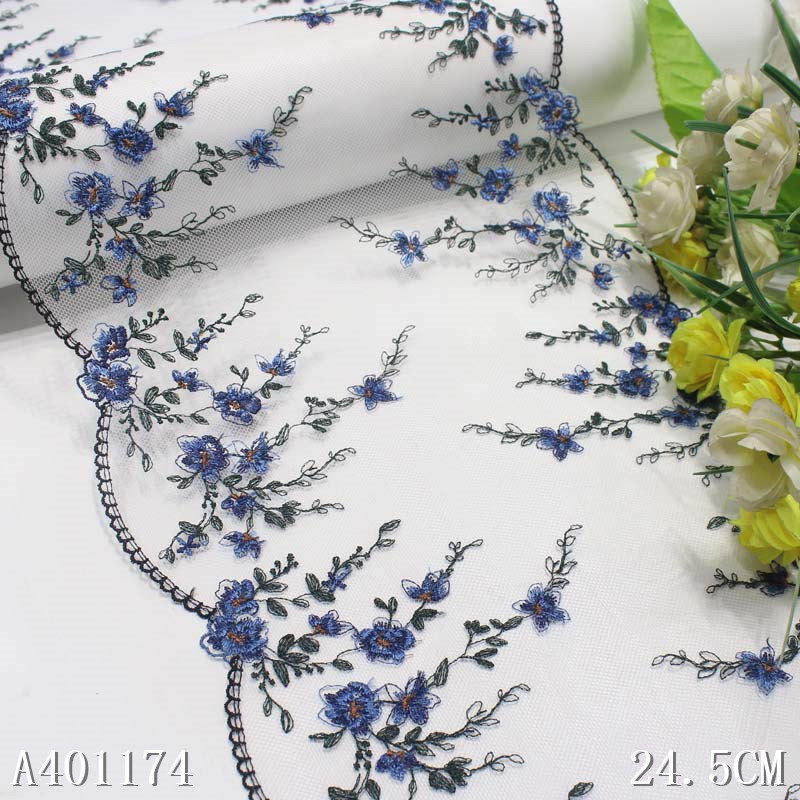 This lace features a white mesh base decorated with blue and green floral embroidery. The flower centers combine blue and brown tones, creating subtle contrast and visual interest.